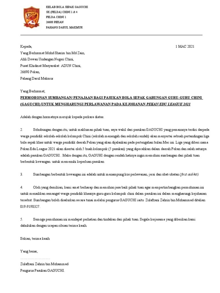 Download & view contoh surat mohon sumbangan yb 19.7 as pdf for free. Kami ingin memohon jasa baik dari pihak yb untuk menghulurkan sumbangan peralatan . Contoh surat mohon sumbangan yb 19 7. Sekolah kebangsaan kampung buda95600 spaoh,bahagian betong.