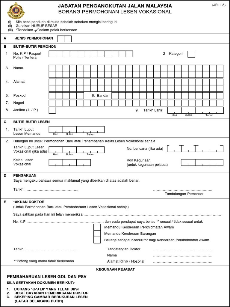 1) lesen gdl kelas e untuk lori kejur ataupun lori rigid. Contoh kad jemputan √ cara dapatkan lesen memandu tanpa test jpj 3) borang jpj l8a termasuk borang medical check up (yang hendak di isi doktor). Jpj l8a" bagi tujuan permohonan atau pembaharuan lesen gdl.